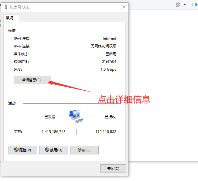 8、在弹出的“以太网状态”窗口中点击“详细信息”