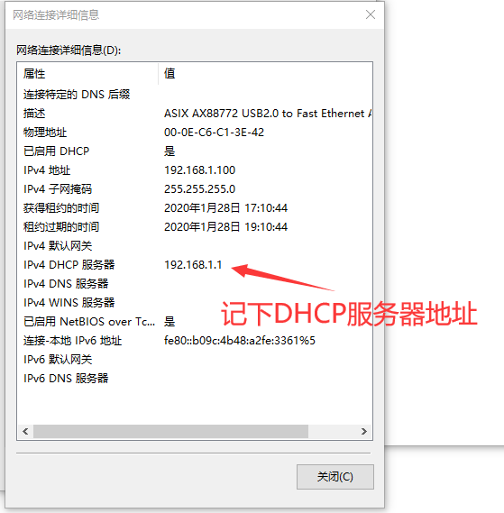 9、找到ipv4DHCP服务器选项的一栏,将后边的ip地址记录下来