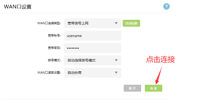 13、接下来点击WAN口设置的连接按键(若账号密码错误或网线未连接好会提示登录失败)