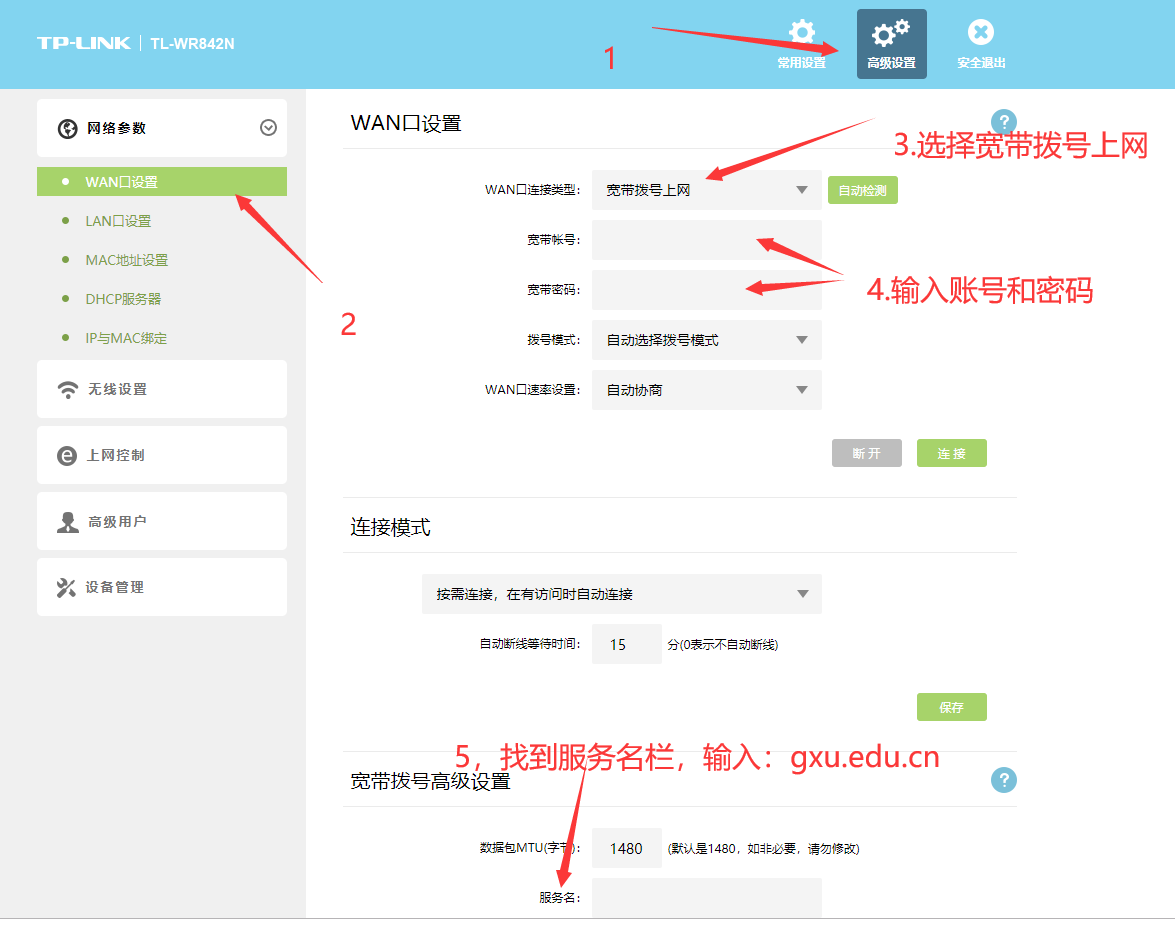 11、按下图步骤点击相应图标找到WAN口设置界面,并在WAN口连接类型处选择“宽带账号上网”或“PPPOE”。在宽带账号处输入上网账号,在宽带密码处输入宽带密码。最后在服务名一栏输入服务名:gxu.edu.cn
