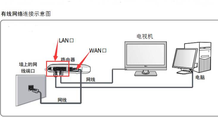 2、将墙上的端口用网线与路由的WAN口连接起来,然后打开电脑,将网线连接电脑网口和路由的LAN口,连接示意图如下: