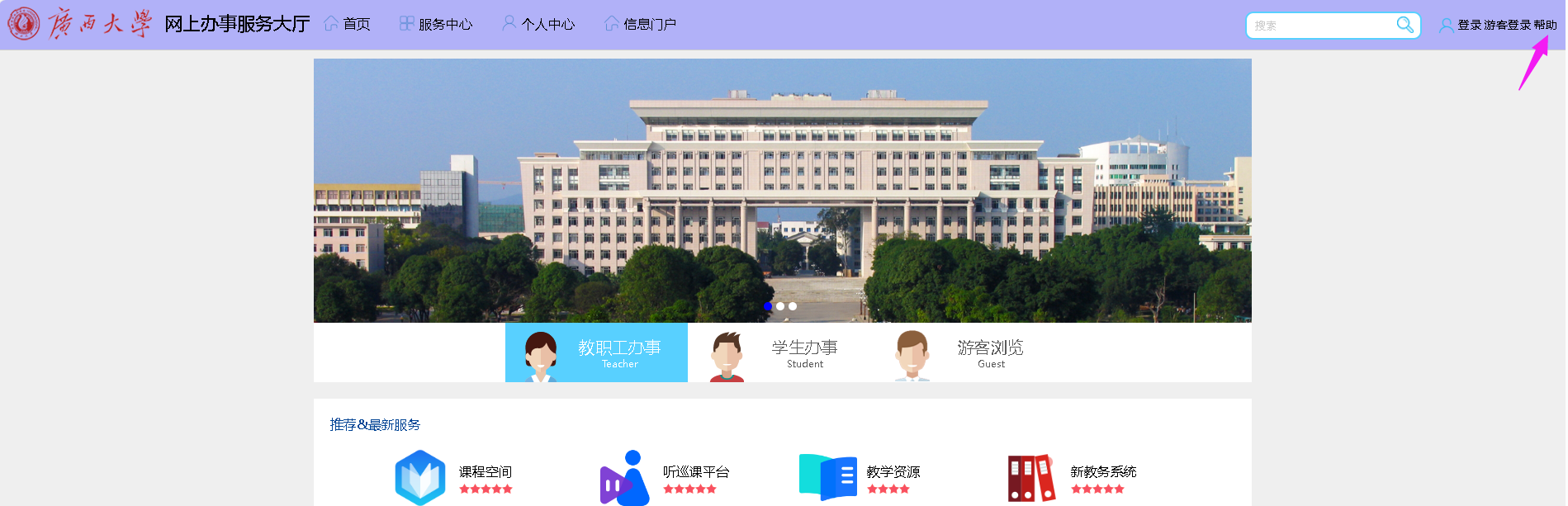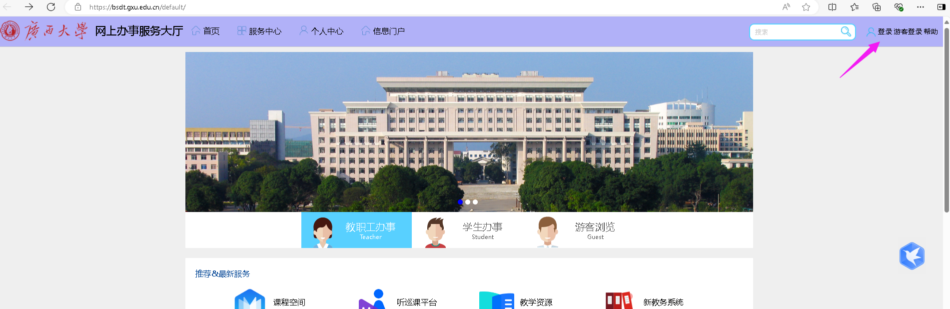 方式二:在浏览器输入网址(bsdt.gxu.edu.cn)即可打开beats365亚洲版网上办事服务大厅的主页。
