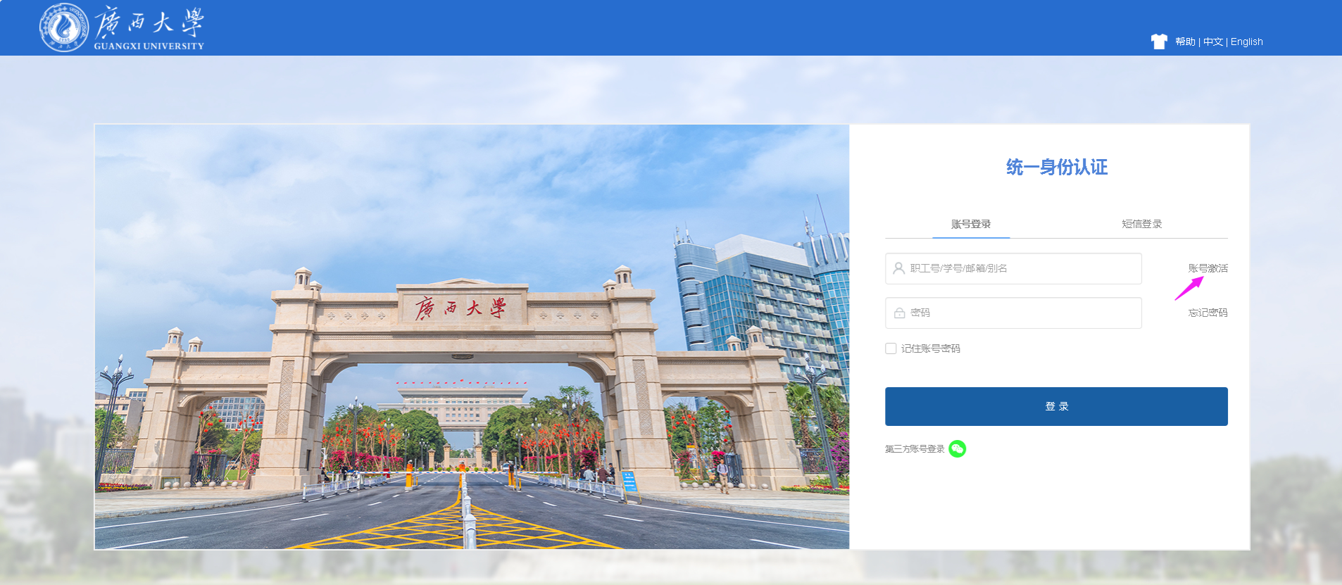 点击右上角【登录】按钮后,进入beats365亚洲版统一身份认证页面。新生账号是学号,首次登录时需要激活,并按要求修改密码。登录统一身份认证中心后进入办事大厅。