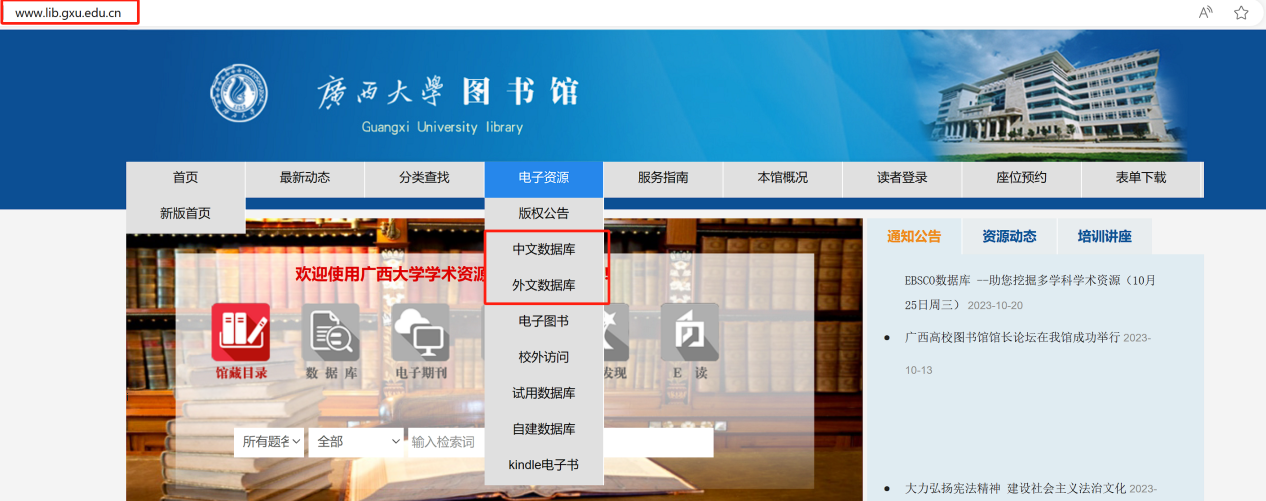 1.进入beats365亚洲版图书馆首页:www.lib.gxu.edu.cn,选择“电子资源”中的“中文数据库”或“外文数据库”。