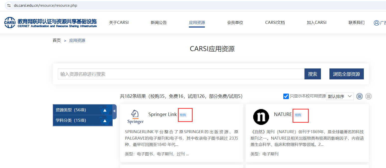 3.在弹出的页面中选择“校购”的数据库资源进行访问即可。