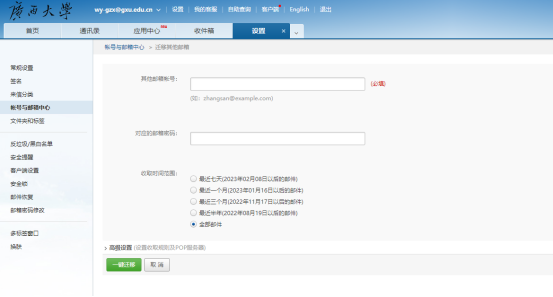 进入邮箱中心设置界面,填写【其他邮箱账号】【对应的邮箱密码】,选择【收取时间范围】,点击【一键迁移】。【注意】:代收的其他邮箱需要开启pop协议,如若开启客户端授权密码则需要授权密码,QQ邮箱和163.com邮箱开启邮箱代收功能请查看本文中的附件一和附件二。