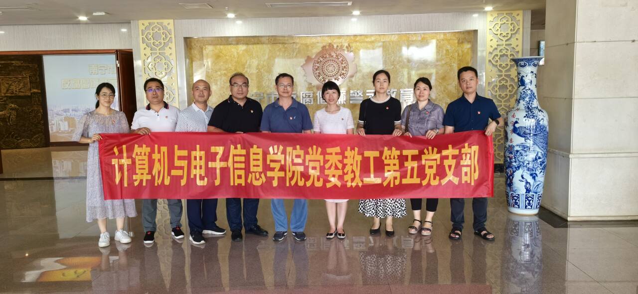 为深入学习贯彻习近平新时代中国特色社会主义思想和党的二十大精神,进一步推动党纪学习教育走深走实, 7月4日,计算机与电子信息学院教工第五党支部(信息网络中心)全体党员前往位于南宁市委党校的南宁市反腐倡廉教育馆,开展党纪学习教育主题党日活动。