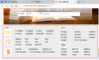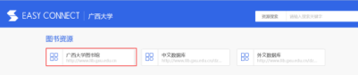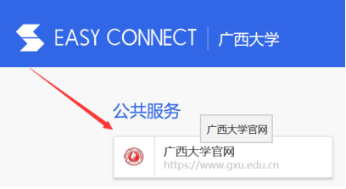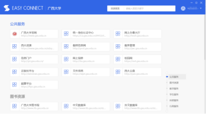 注:用户登录后仅允许通过该门户资源页面跳转访问校内资源,不支持通过浏览器地址栏单独输入校内地址访问,否则无法正常访问到校内资源。如果不小心关闭了此资源列表页面,则需重新输入网址https://vpn.gxu.edu.cn打开此页面。