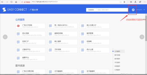登录成功后可看到WEB VPN门户资源列表,用户可直接通过门户中的资源列表访问到校内资源,点击右上角的人像图标可退出VPN系统。