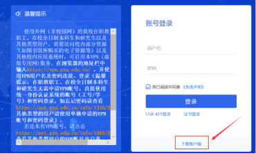 访问https://vpn.gxu.edu.cn 在登录框下方找到“下载客户端”连接,选择终端类型进行下载。