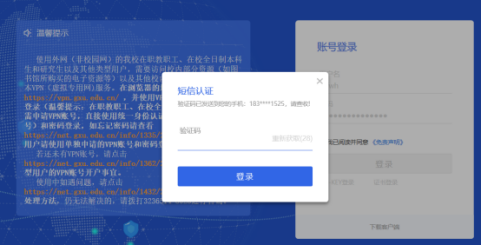 首先在电脑终端打开浏览器,在地址栏输入https://vpn.gxu.edu.cn 访问到VPN登录界面,输入账号、密码,点击登录,然后进行短信认证。