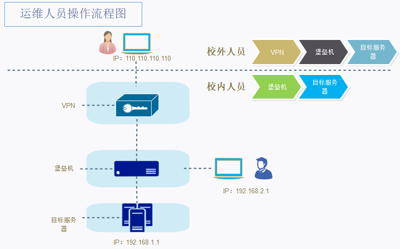 1) 校外运维:登录VPN->登录堡垒机->访问目标服务器