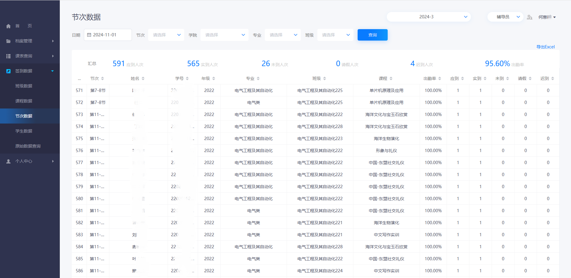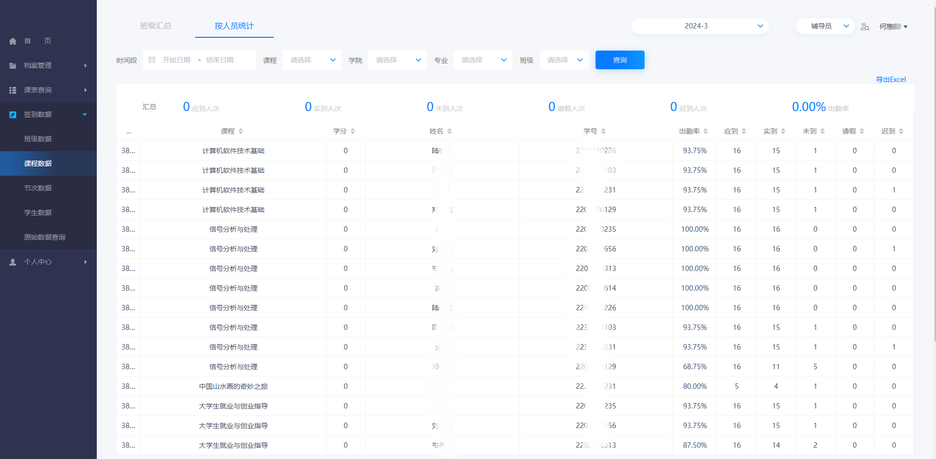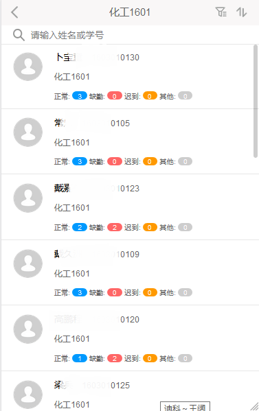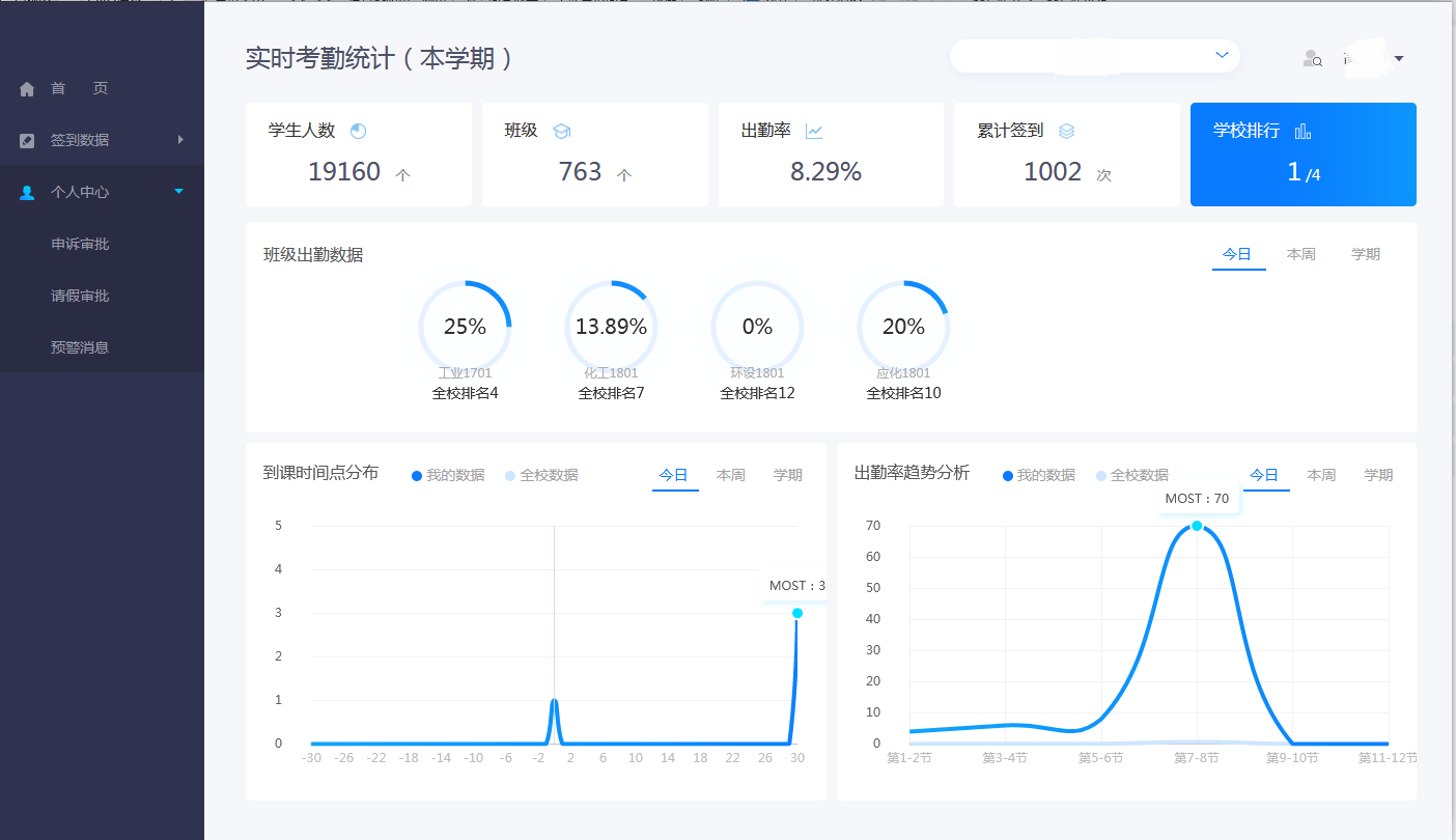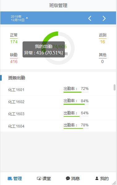 首页展示辅导员所有管理班级的签到情况,汇总统计。也可针对某个学生查看缺勤的签到情况及学生的个人信息。