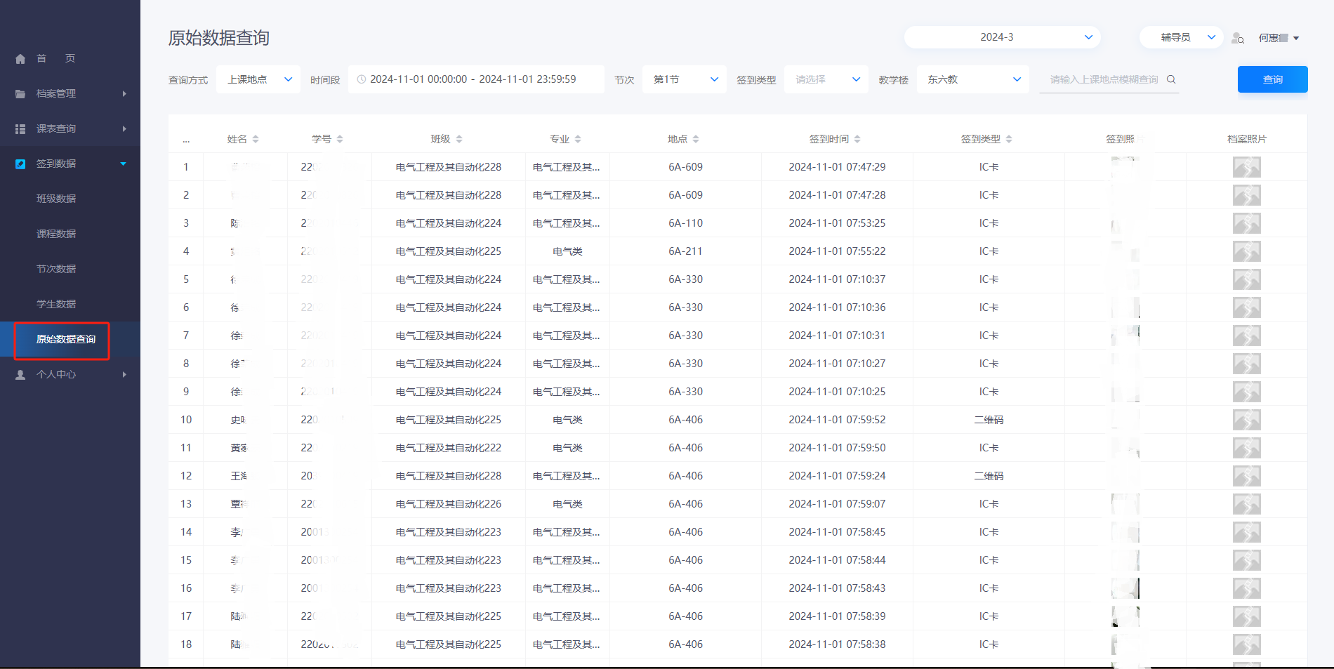 数据查询分为:可查看班级数据、课程数据、节次数据、学生数据和原始记录查询。