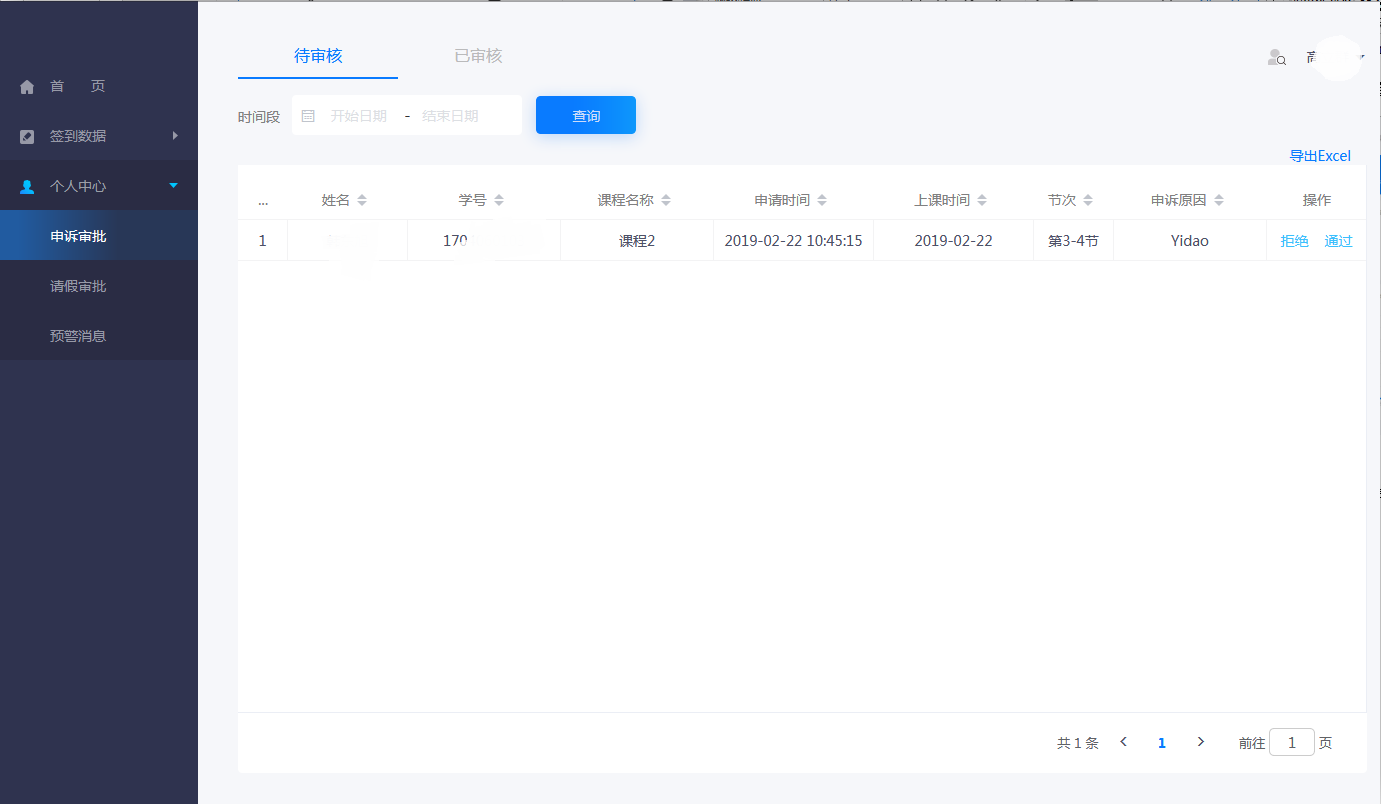 申诉审批:学生通常由于各种原因没有签到但正常出勤上课而发出的申诉申请,需审批核实从而改变签到状态。