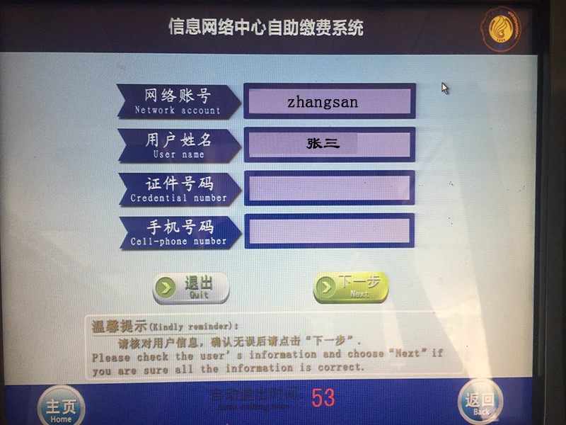 D 自助缴费机缴费——仅支持银联卡缴费,不接受现金。自助缴费机在网络大楼一楼大厅右侧,共两台。
