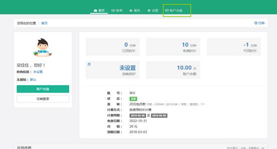 1) 点击自服务首页“注销登录”上方的的“账号充值”,可直接进入在线充值界面