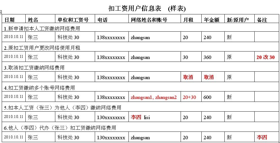 “扣工资用户信息表”,见下面样表;建议用户缴纳网络使用费至当年年底(即12月)。