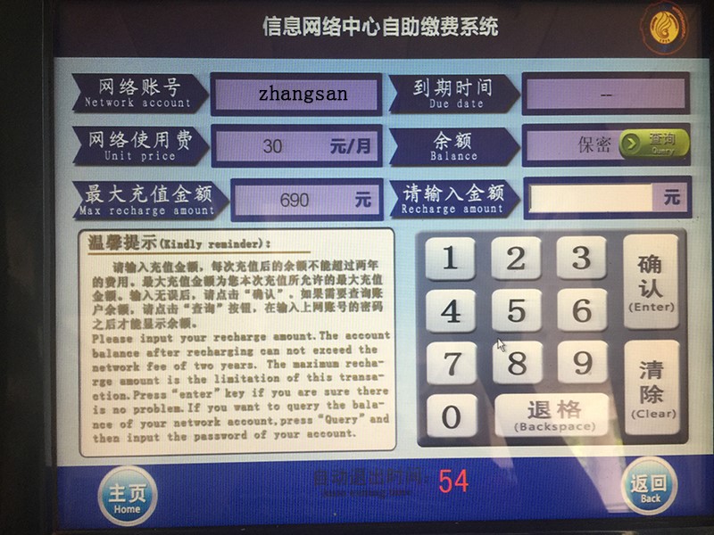 B-4 用户持网络费用缴纳清单和内部转账凭证(绿色单,如只有黑色单请将其复印)到网络中心办理网络费用充值。