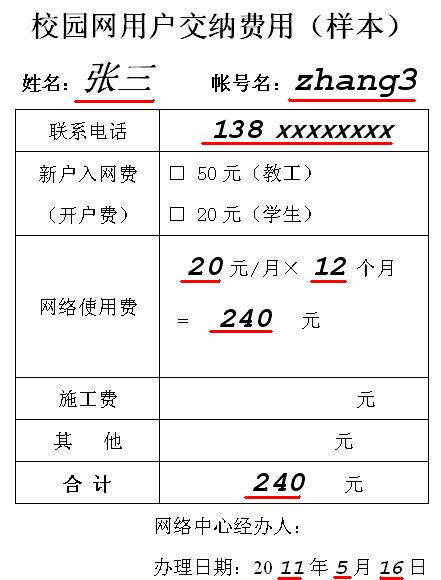 A-1 用户填写“网络费用缴纳单”(姓名、账号、使用月租、使用月数、缴纳金额总数等)1份,见下面样单;