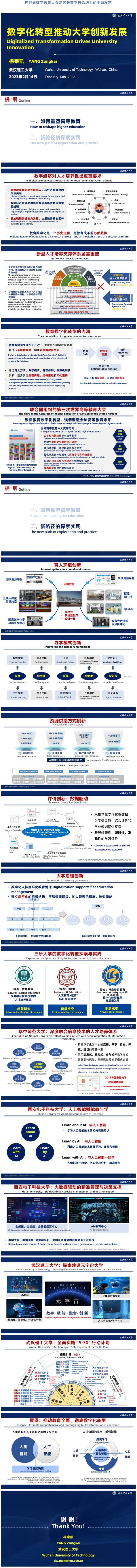 我今天跟大家汇报的题目是《数字化转型推动大学的创新发展》。我报告的内容大概两个方面:第一,谈一下怎么来重塑数字经济时代的高等教育。第二,跟大家汇报一下我这些年的一些探索和实践。